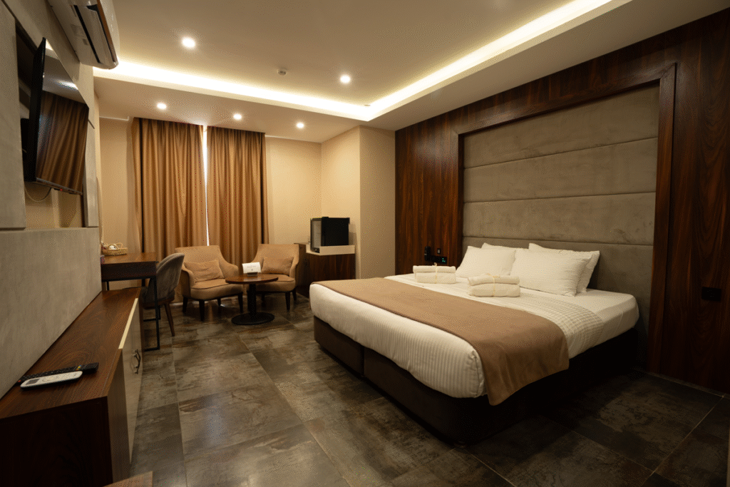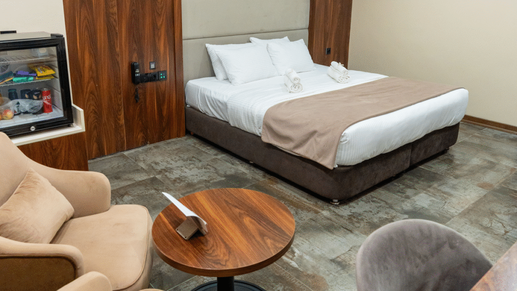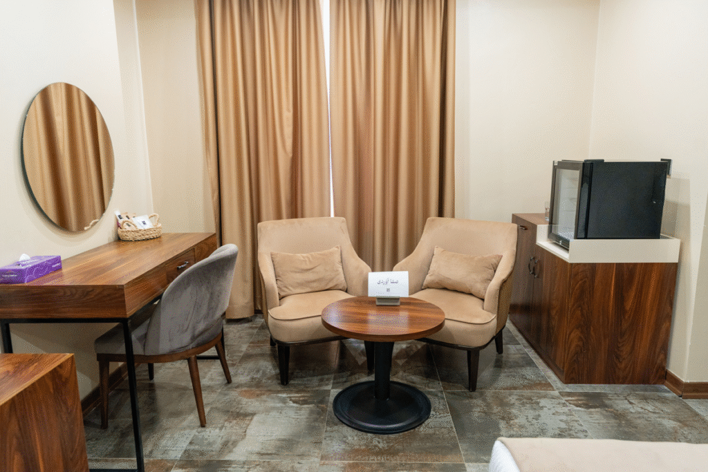 • ساعت تحویل اتاق 14 ظهر و ساعت تخلیه اتاق 12 ظهر می‌باشد.